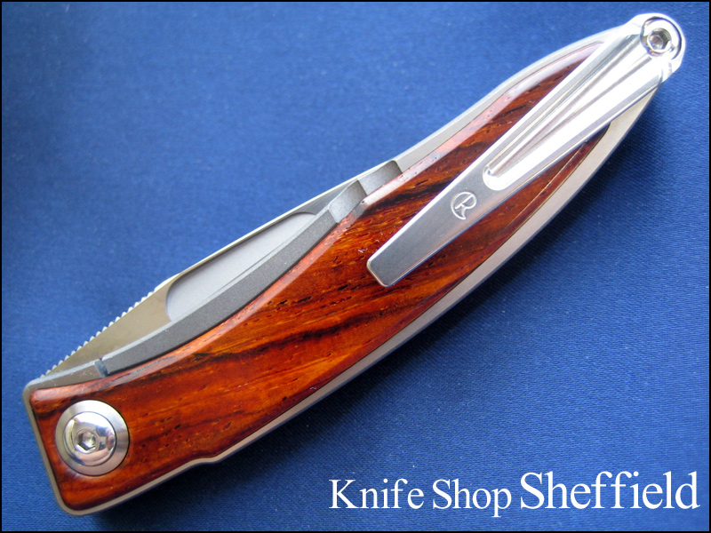 ブレードには高級鋼材S35VNが用いられており、正確かつ非常に丁寧にホローグラインドされています。両側に大型サムネイルが設けられており、デザイン上のアクセントにもなっています。軽く滑らかなアクションで、オープン時のブレードはインテグラルロックによりガタつきなくしっかりとロックされます。もちろん箱出しの状態で素晴らしい切れ味を実感して頂けます。ハンドルは軽量かつ頑丈なチタン製で、両側にはココボロがぴったりとインレイされています(オンレイではありません!)。ここにもクリス・リーブらしいこだわりが感じられます。ベルトクリップもチタンの削り出しで、左右付替え・取外し可能。