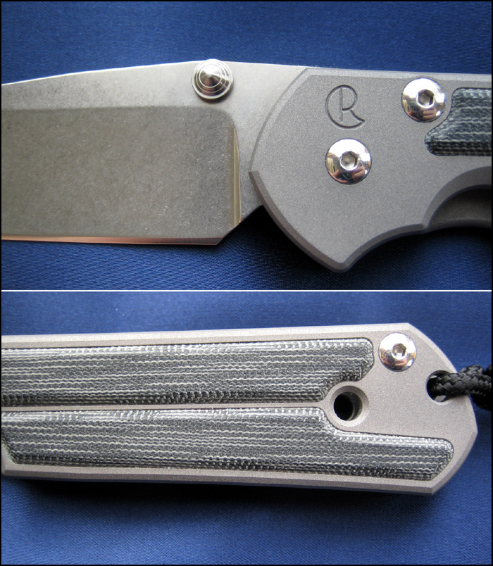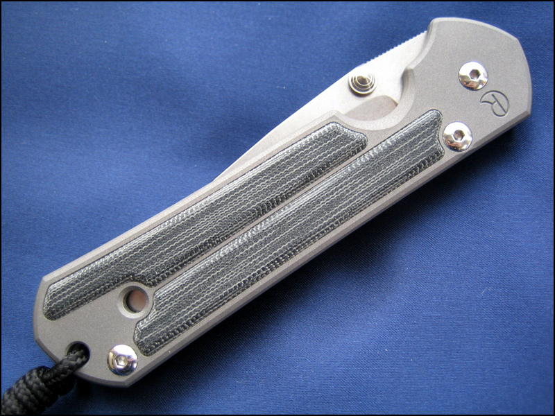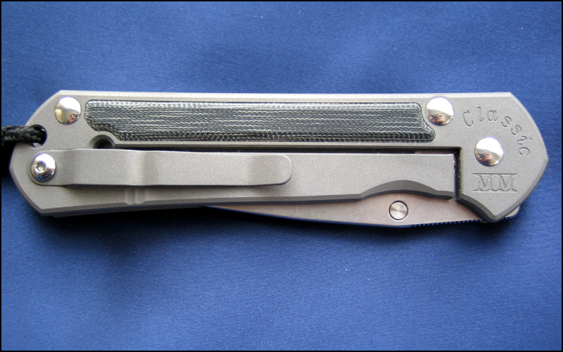 ハンドルは軽量かつ頑丈なチタン製で、表面はビードブラスト・フィニッシュ、ソングホールが設けられています(コード付き)。ハンドルのマイカルタはオンレイではなく手間のかかるインレイで、隙間無くぴったりとはめ込まれています。ここにもクリス・リーブらしいこだわりが感じられます。取り外し可能なベルトクリップが付属しています。