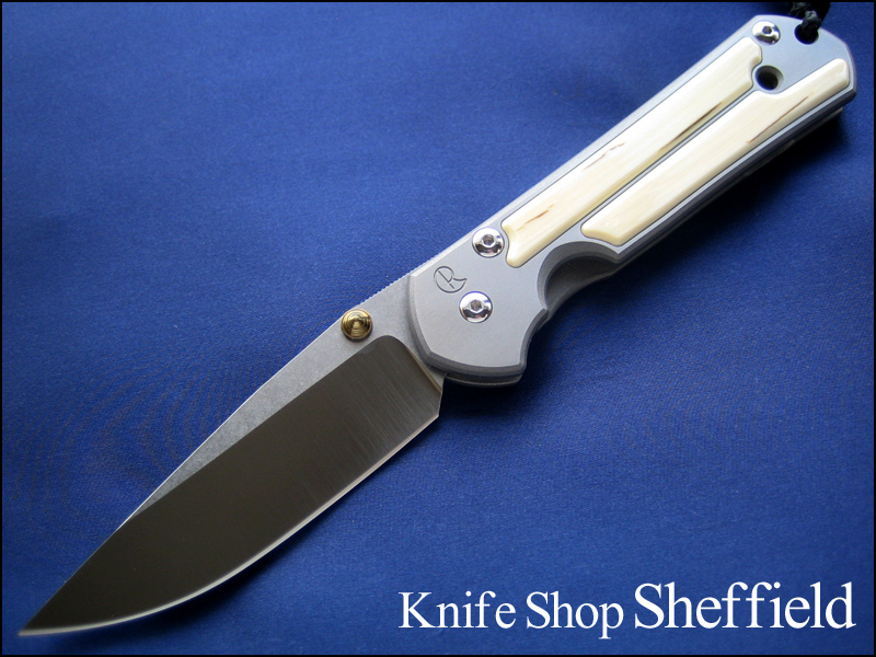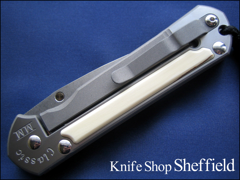ハンドルは軽量かつ頑丈なチタン製で、表面は美しくポリッシュされています(一部ビードブラスト・フィニッシュ)。ハンドルのマンモス・アイボリーはオンレイではなく手間のかかるインレイで、隙間無くぴったりとはめ込まれています。ここにもクリス・リーブらしいこだわりが感じられます。取り外し可能なベルトクリップが付属しており、ソングホールが設けられています(コード付き)。