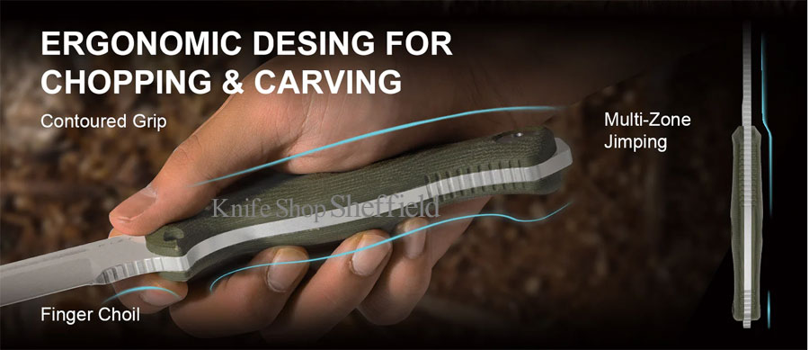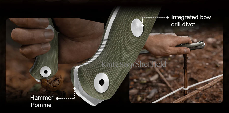 手になじみ握りやすい形状のマイカルタハンドル、弓ぎり式火おこしに便利なディボット(凹み)付き